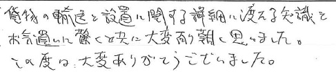 <p>重量物の移動にも関わらず、丁寧かつ迅速に対応いただきました</p>