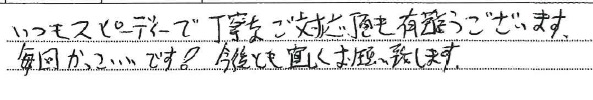 <p>いつも早い、丁寧で たいへん満足です</p>