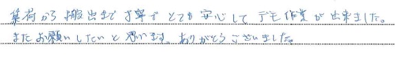 <p>集荷から搬出まで丁寧でとても安心してデモ作業が出来ました。</p>